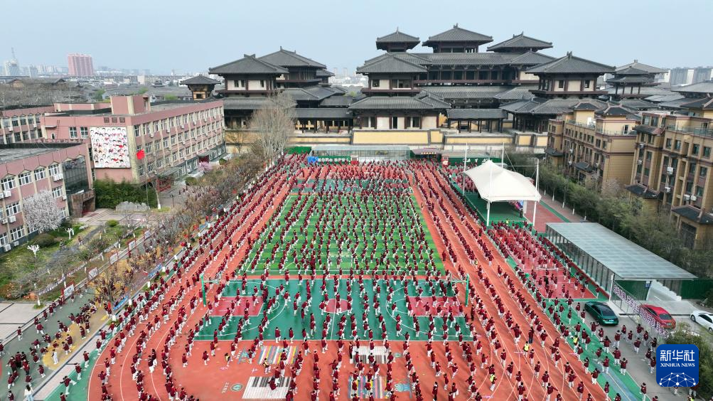 3月26日,在日照市莒县第一实验小学,同学们在进行阳光大课间活动(无人机照片)。新华社记者 郭绪雷 摄