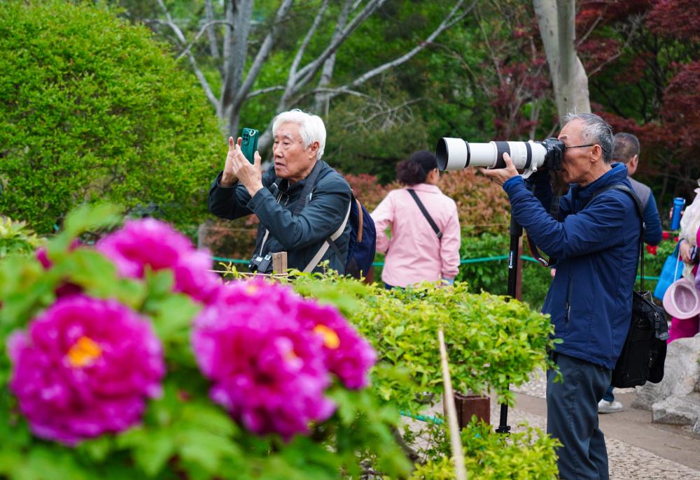 4月9日,摄影爱好者在济南市泉城公园拍摄牡丹花。新华社记者 徐速绘 摄