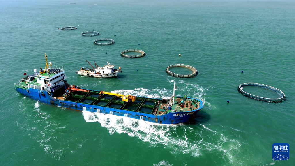 4月10日,山东青岛西海岸新区鲁海丰海洋牧场2026年首批10万尾鱼苗投入深水网箱进行养殖。据悉,青岛鲁海丰海洋牧场地处国家一类水质海域,水温适宜、盐度均衡,比较适宜海鱼生长。新华社发(俞方平摄)