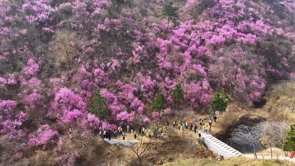 在山东日照五莲县九仙山,杜鹃花迎来盛放期。层层叠叠的花簇铺展山野,吸引各地游客前来踏青赏花。