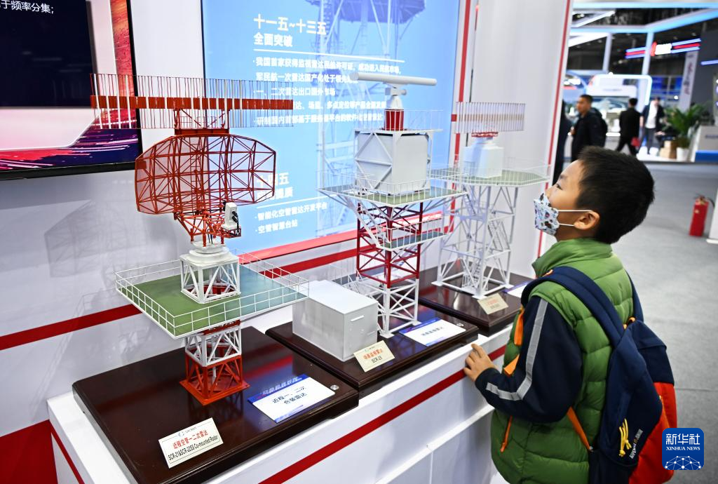 4月18日,一名男孩在雷达未来大会展览区观看空管雷达模型。