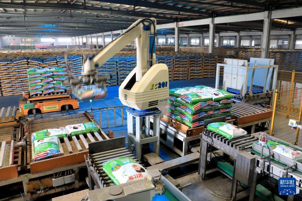 4月25日,在山东省临沂市临沭县一家化工企业,机械臂在搬运成品复合肥。新华社发(林海珍 摄)