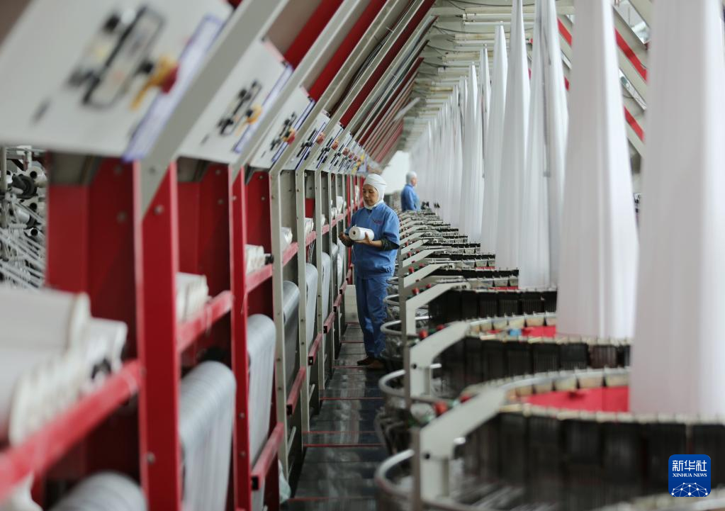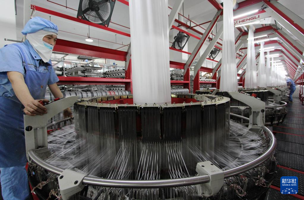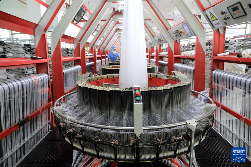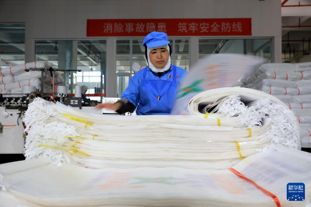 4月25日,在山东省临沂市临沭县一塑编企业车间,工人加工塑编产品。新华社发(王彦冰 摄)
