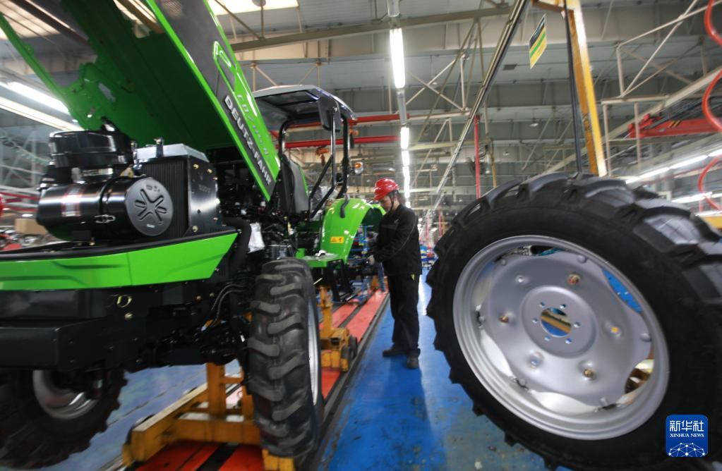 4月25日,在山东省临沂市临沭县一家机械制造企业,工人在车间内组装农机产品。新华社发(武纪全 摄)