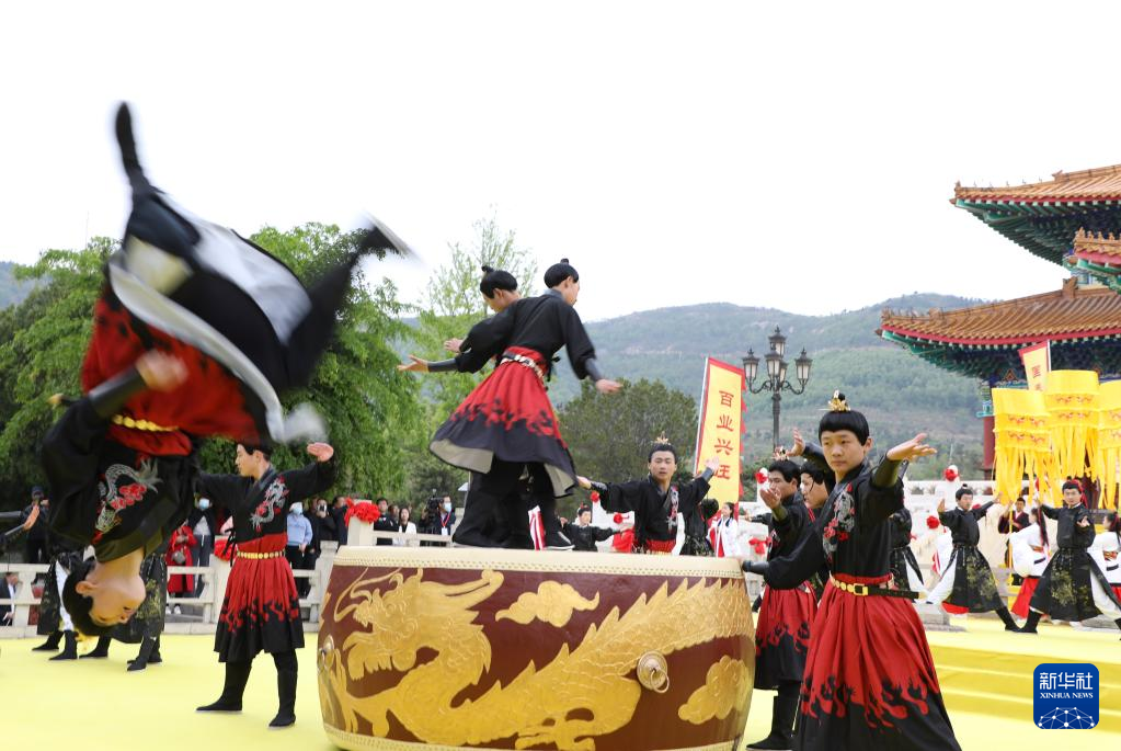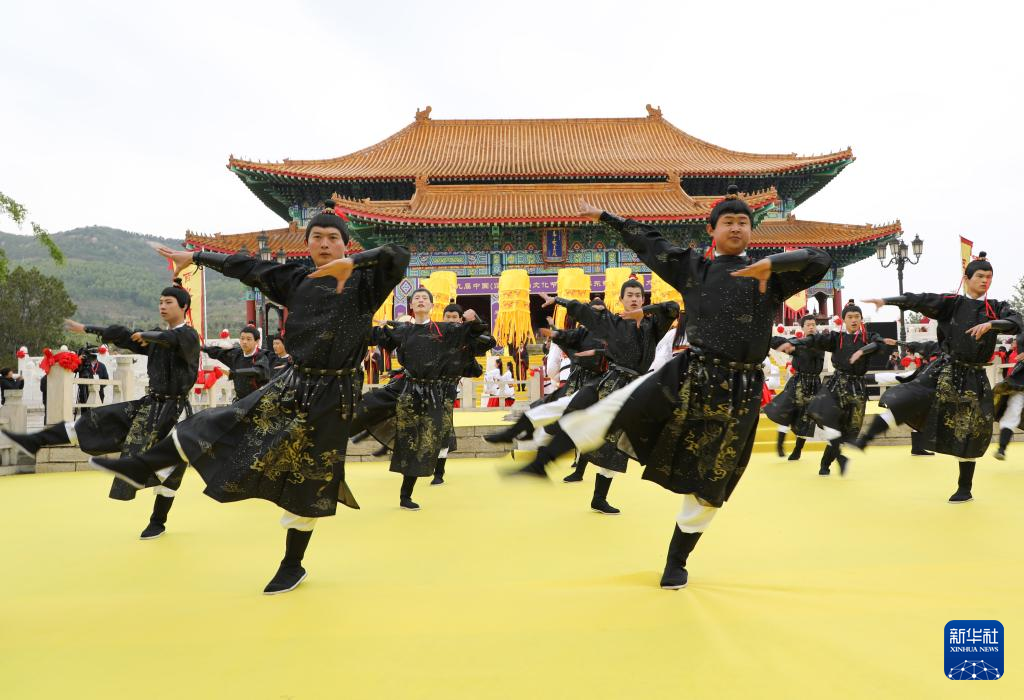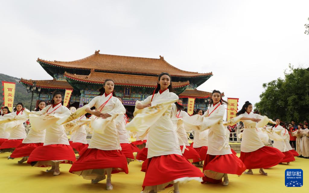 4月25日,在山东沂山风景区,演员在祀山大典上表演“乐舞”。新华社发(孙树宝 摄)