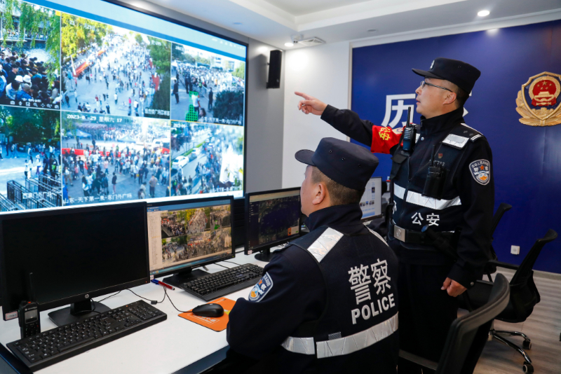 2023年4月29日,在泉城中心警务站视频调度室,值班民警对各景点进行实施监控巡查。(张亦凡 摄)