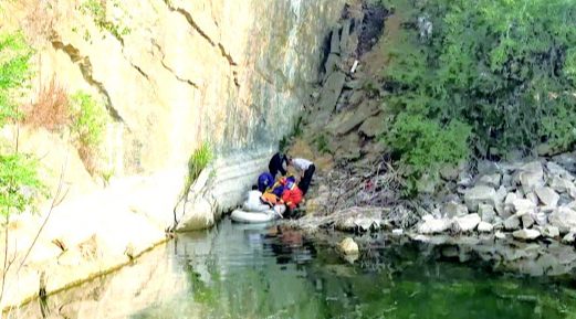 消防员到达现场后看到,事发地是一处废弃石坑,形如悬崖,崖下常年积水形成池塘,被困人员摔落在池塘岸边乱石之中,具体情况不明。在池塘旁边,已有村民找来橡皮艇从对面缓坡下到崖底准备救人。因为橡皮艇的载重有限,指挥员决定由一名消防员携带担架,陪同医护人员乘坐橡皮艇到达对岸,与之前已经赶到被困人员身边的两名村民合力施救。
