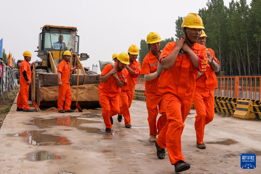 5月18日,参加演练的中铁四局施工人员在现场抢运沙袋。新华社记者 朱峥 摄