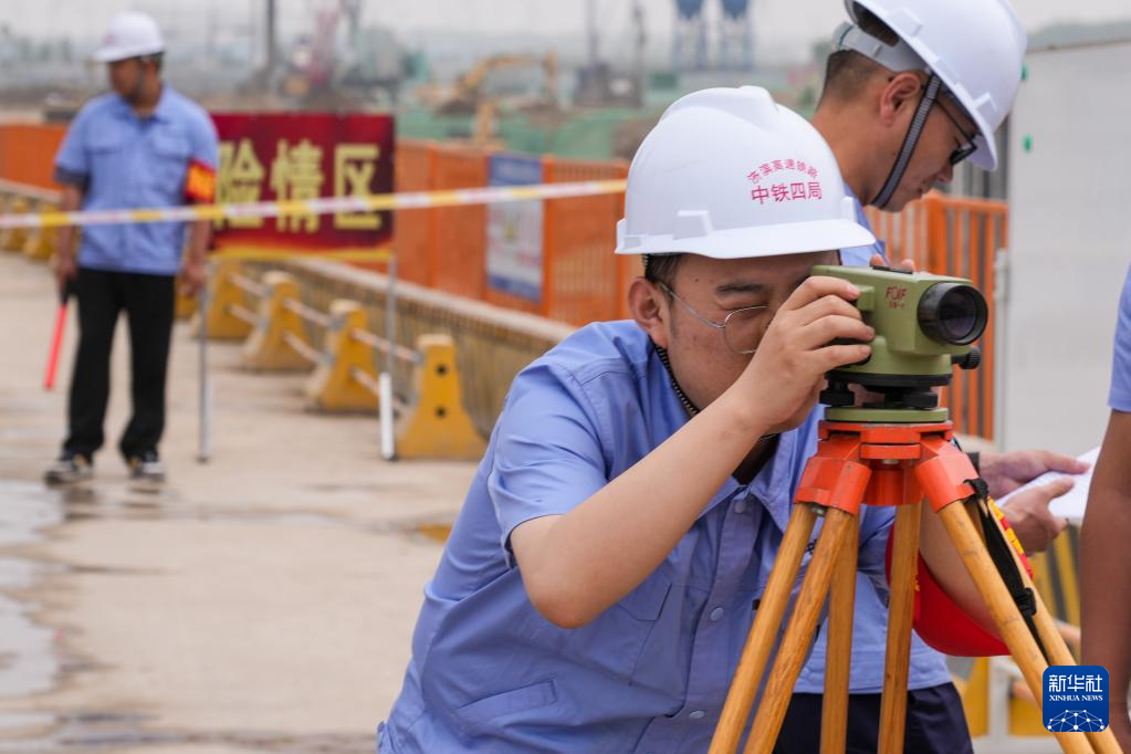 5月18日,参加演练的中铁四局施工人员在现场测量数据。新华社记者 朱峥 摄
