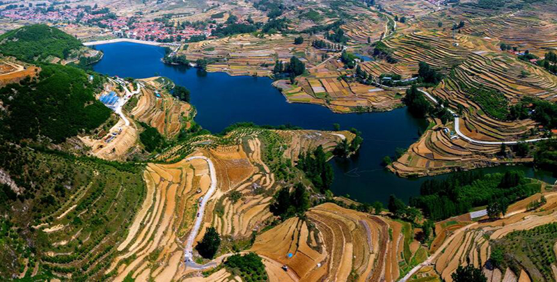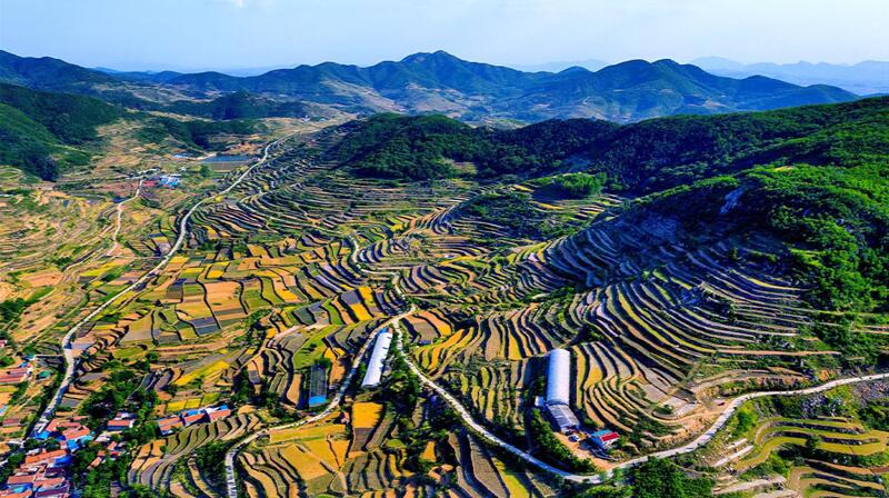 初夏时节,在山东省日照市,在莒县起伏连亘的群山中,一座座几十级、上百级的梯田,从山脚顺着坡势蜿蜒向上伸展。