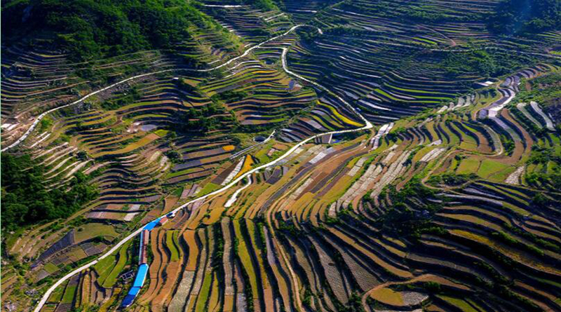 从空中俯瞰,梯田阡陌纵横,线条优美流畅,梯田、青山、河流、道路与错落有致的红瓦房相映成景,组成一幅幅千姿百态的天然画卷。层层叠叠的梯田如同色彩斑斓的调色盘,美不胜收。(宋洪飞 严洪博)(完)