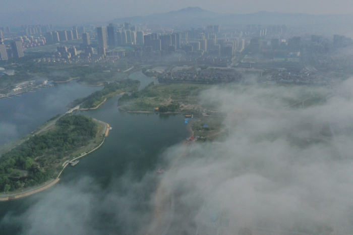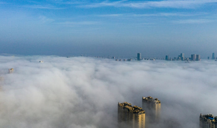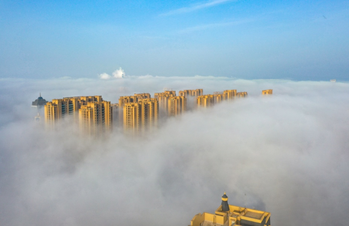 6月2日,山东省日照市东港区沿海出现平流雾景观,从海上飘来的雾气飘飘渺渺,高层建筑被雾气围绕时隐时现,从空中俯瞰海滨城市气象万千、美如仙境。(宋洪飞)