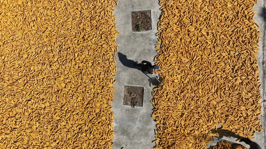 农民在聊城市茌平区杜郎口镇张庄村晾晒玉米 马红坤 摄