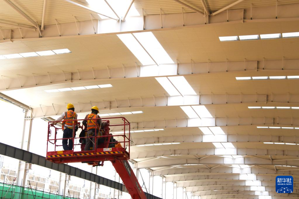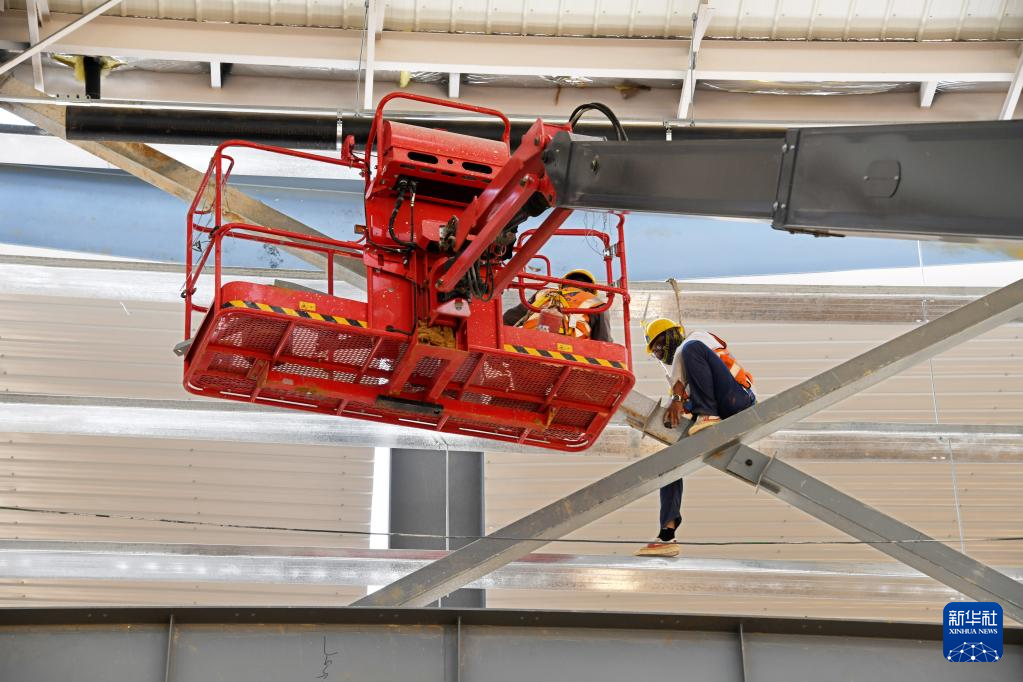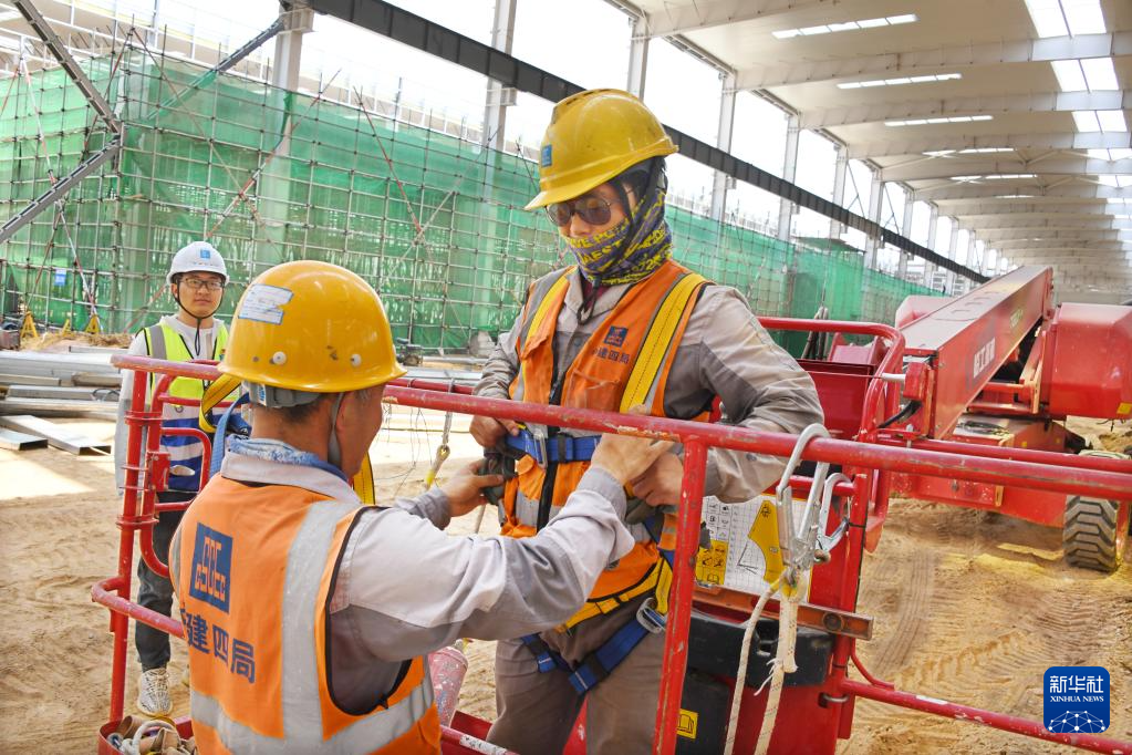 6月6日,中建四局建设者在联合厂房车间进行高空安装作业。