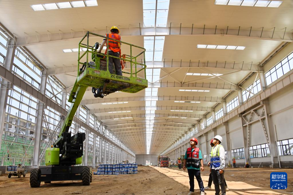 6月6日,中建四局建设者在联合厂房车间进行施工作业。