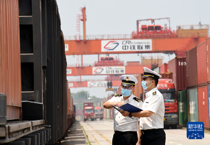 6月1日,青岛海关工作人员在上合示范区多式联运中心内查验“上合快线”国际班列。新华社记者 李紫恒 摄