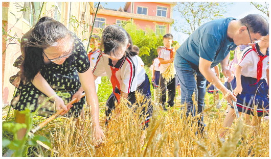 夏日骄阳下,在山东省淄博市周村区凤鸣小学校园内开辟的一块麦田里,金色麦穗随风舞动。为了让学生体验农耕文化,6月9日,该校开展麦收节开镰收割活动——识麦、割麦、收麦、诵麦。在同学们的巧手下,麦秆还被制作成一个个充满创意的艺术作品。