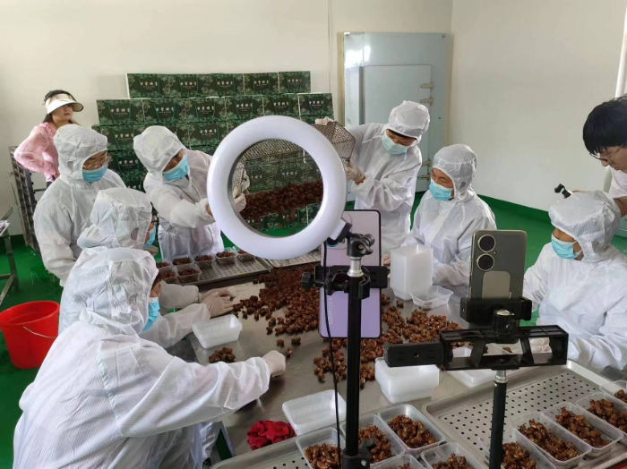 在田镇街道台孙村的高青益民农业专业合作社加工车间内,大量金蝉正在被清洗、分拣、装盒。同时,工作人员进行现场直播,向线上的顾客介绍本地金蝉的特色。每年的6月底到7月中下旬,是金蝉大量出土的时间,金蝉集中上市,为了延长销售时间,保证新鲜口感,工作人员及时用超声波把它清洗干净并分装冷藏。