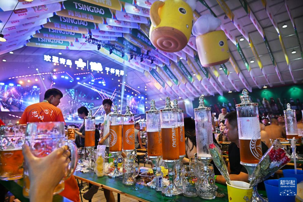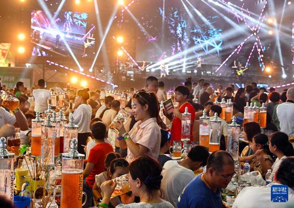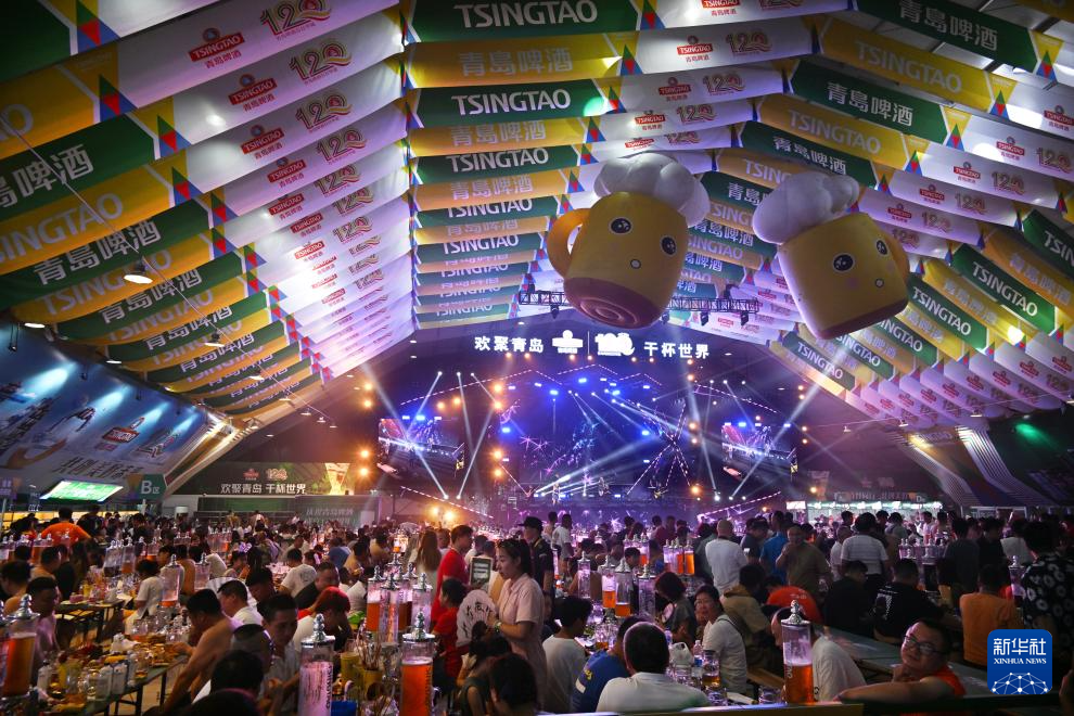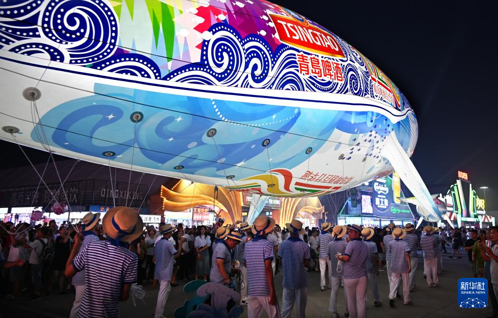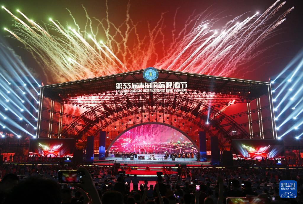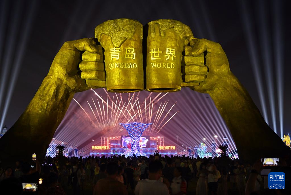7月14日晚,第33届青岛国际啤酒节在青岛西海岸新区金沙滩啤酒城开幕。本届啤酒节优化打造啤酒大篷区、互动游乐区、休闲美食区、啤酒文化博览区等七大功能分区,包含音乐演出、艺术巡游、体育竞演等300多场活动。新华社记者 李紫恒 摄