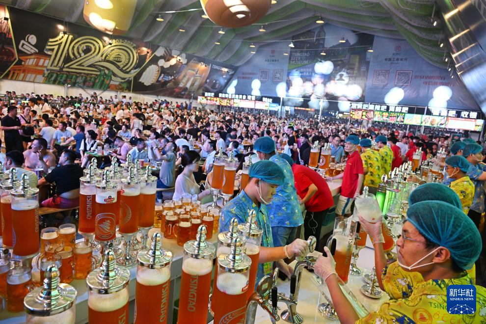 7月14日,金沙滩啤酒城一啤酒大篷内的工作人员在为顾客服务、备酒。