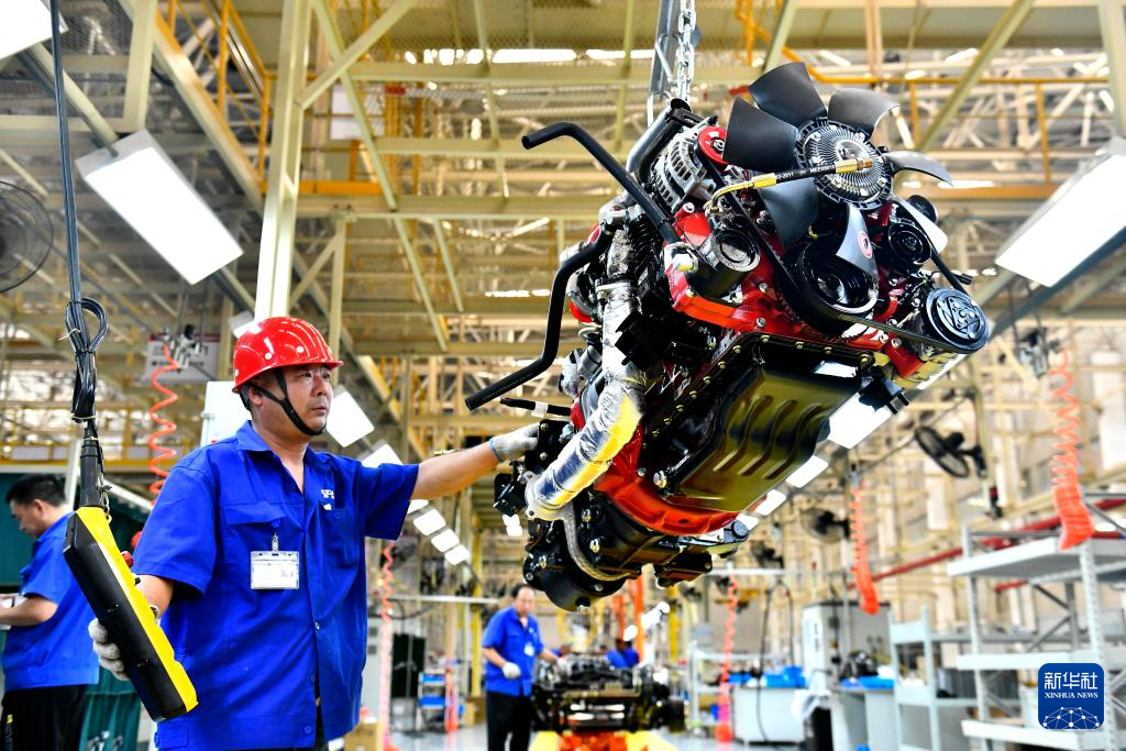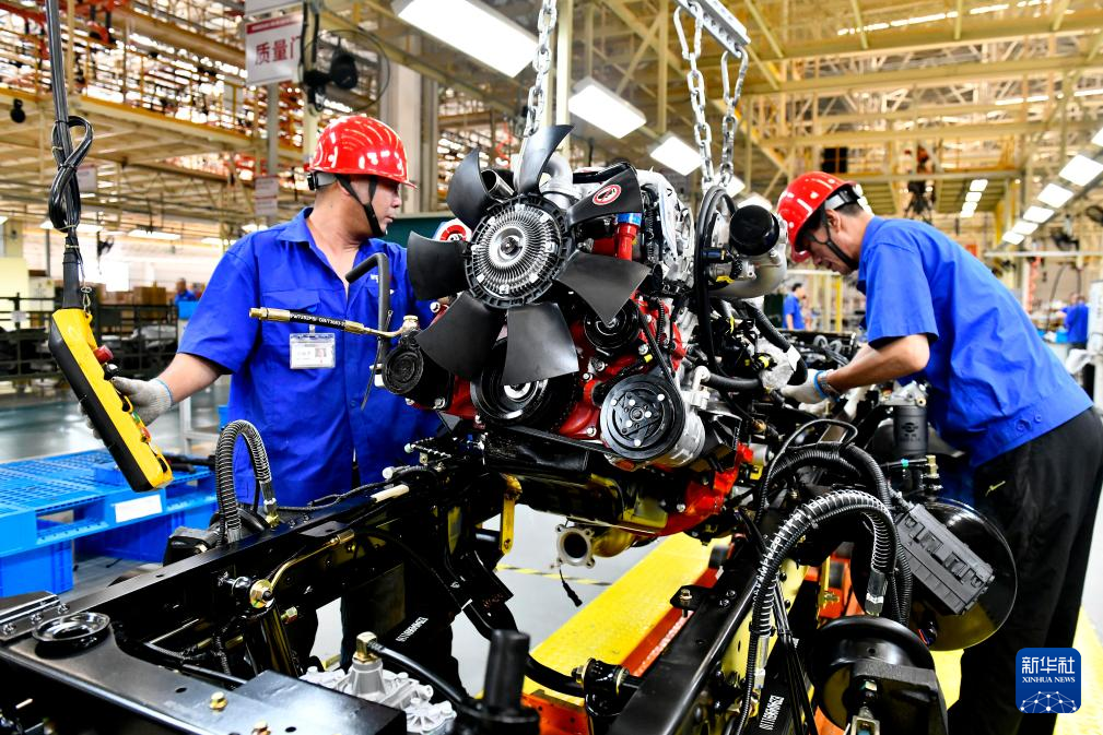7月21日,在位于威海市文登区的潍柴新能源商用车有限公司,工人在生产线上吊装发动机。