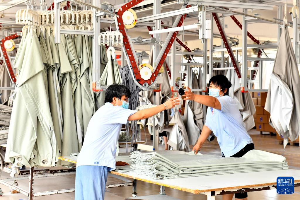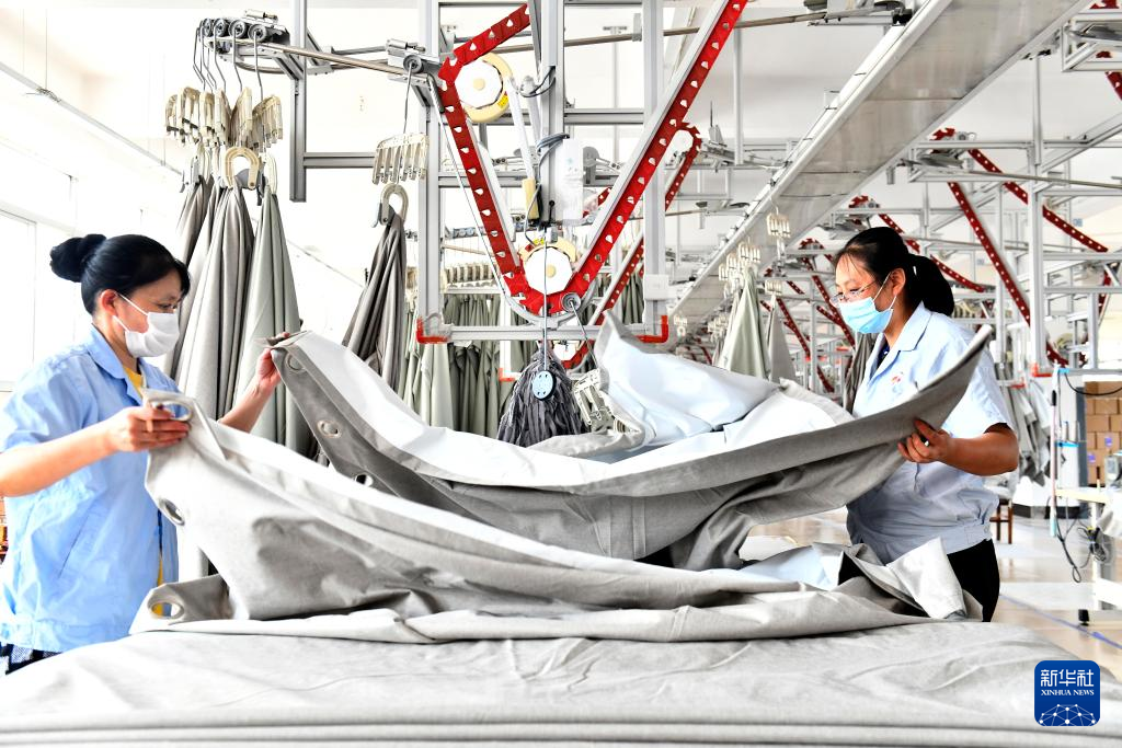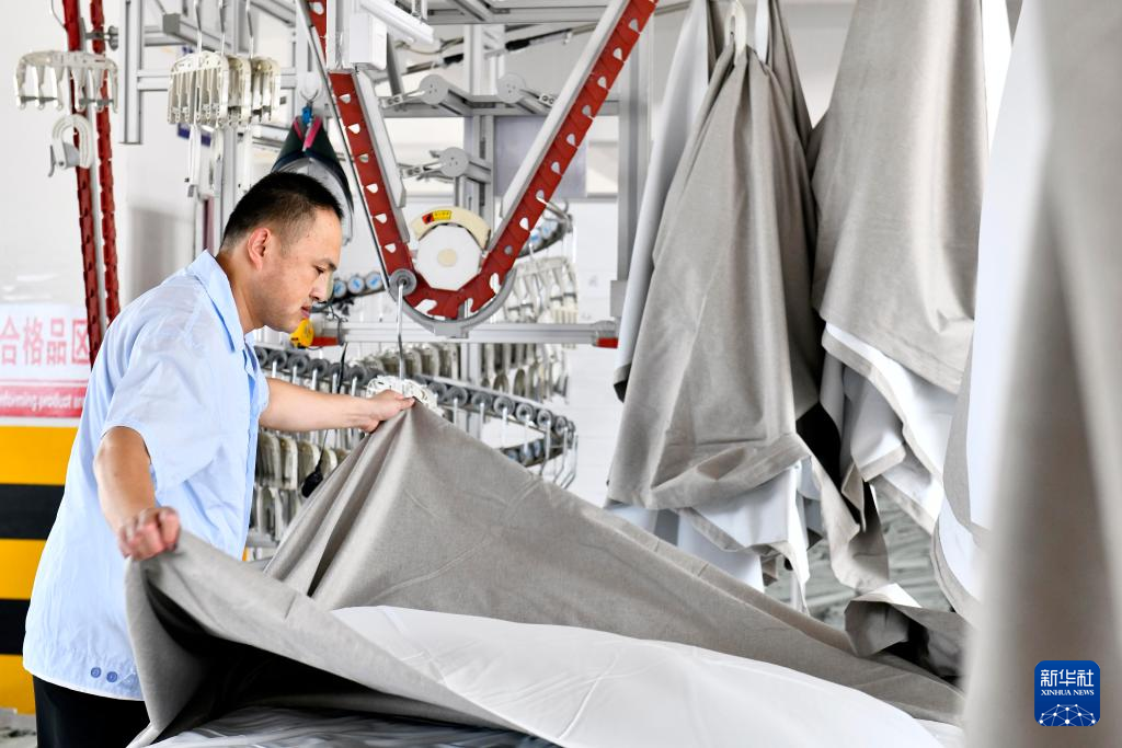 7月21日,在位于威海市文登区的山东银丰家用纺织品有限公司,工人在加工家纺产品。