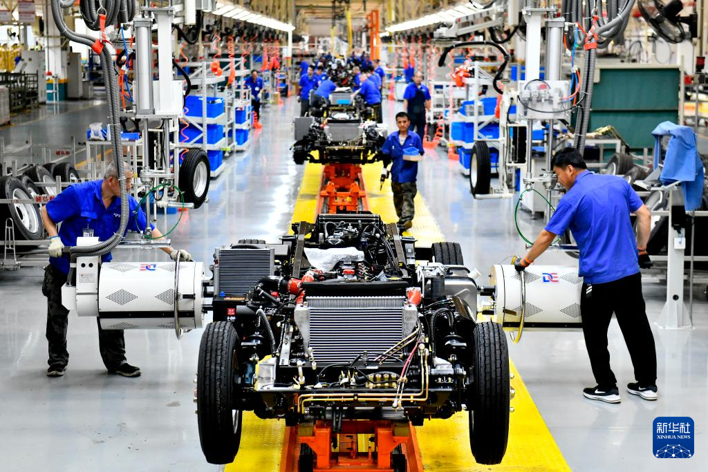7月21日,在位于威海市文登区的潍柴新能源商用车有限公司,工人在生产线上装配汽车。