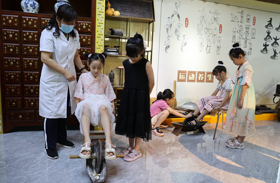 孩子们在山东省博兴县中医院中医药文化馆体验传统中药粉碎技艺