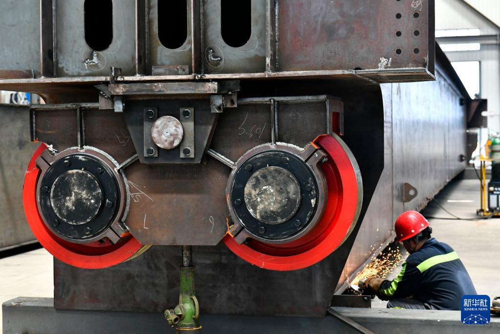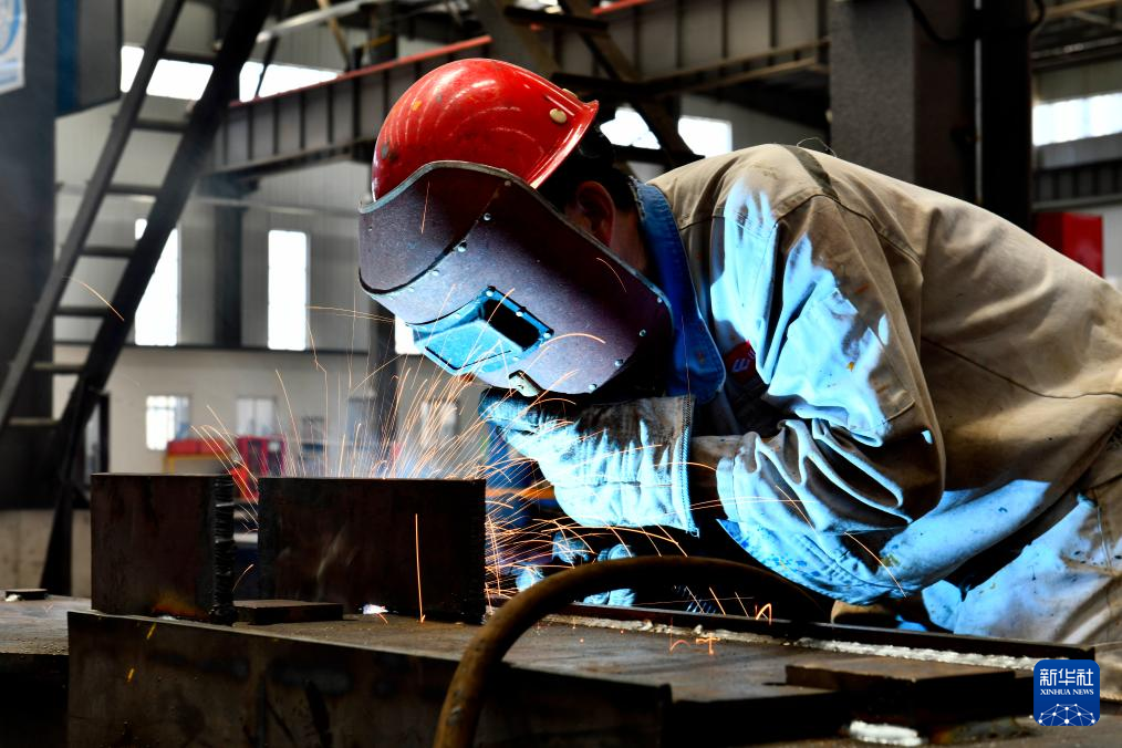 8月5日,在位于日照市东港区的山东力山特智能科技有限公司,工作人员在焊接智能行车设备。新华社记者 郭绪雷 摄