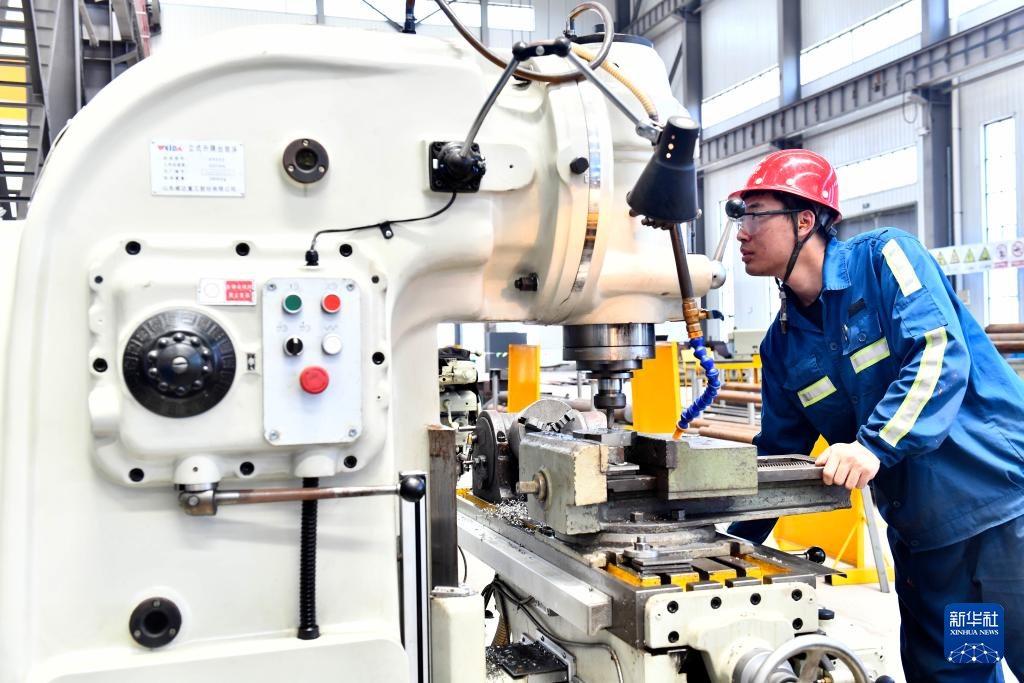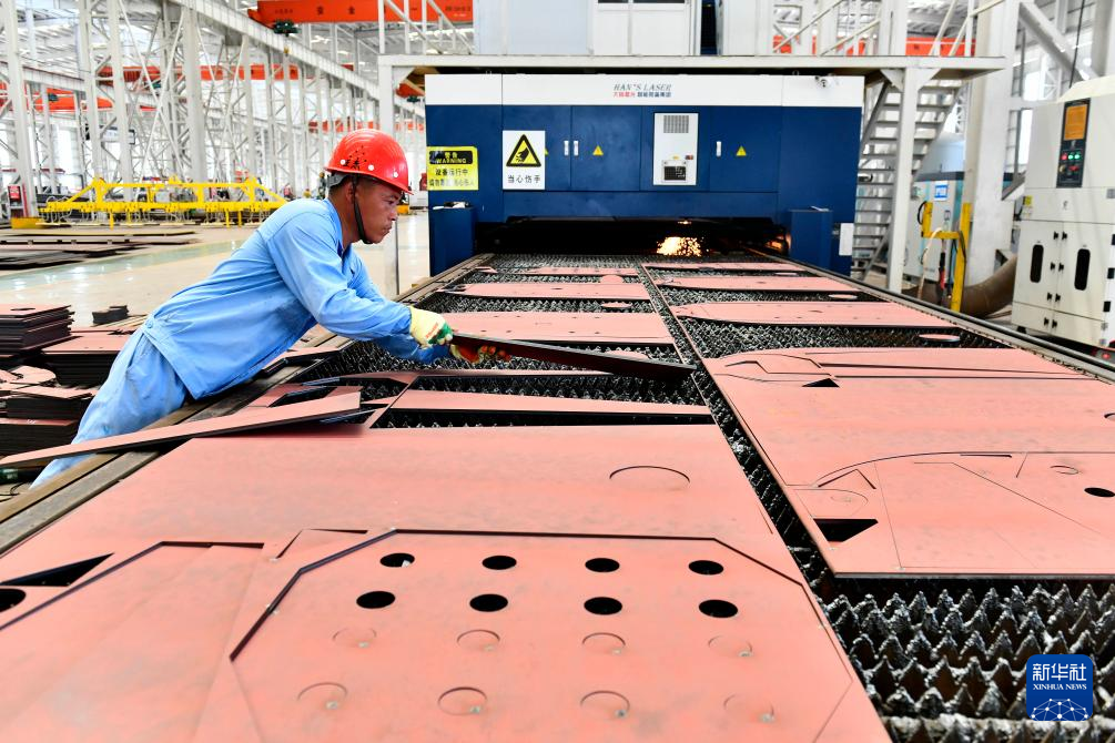 8月5日,在德誉精工科技(日照)有限公司,工作人员在查看激光设备切割后的钢板。新华社记者 郭绪雷 摄