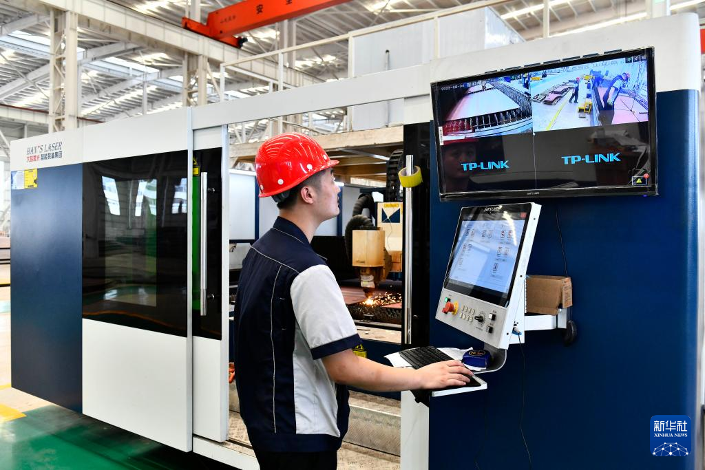8月5日,在德誉精工科技(日照)有限公司,工作人员操作激光设备按客户要求切割钢板。新华社记者 郭绪雷 摄