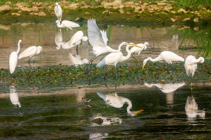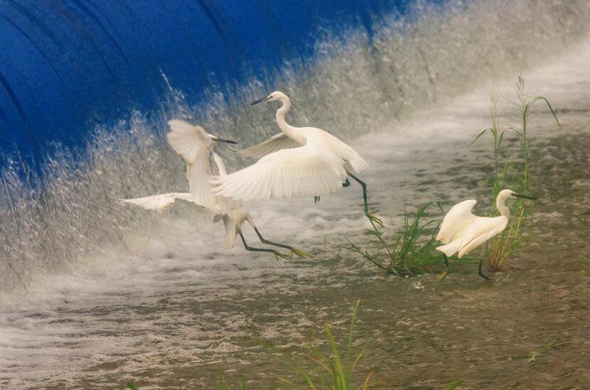 在山东省五莲县洪凝河,白鹭在翩翩起舞。王义全 摄