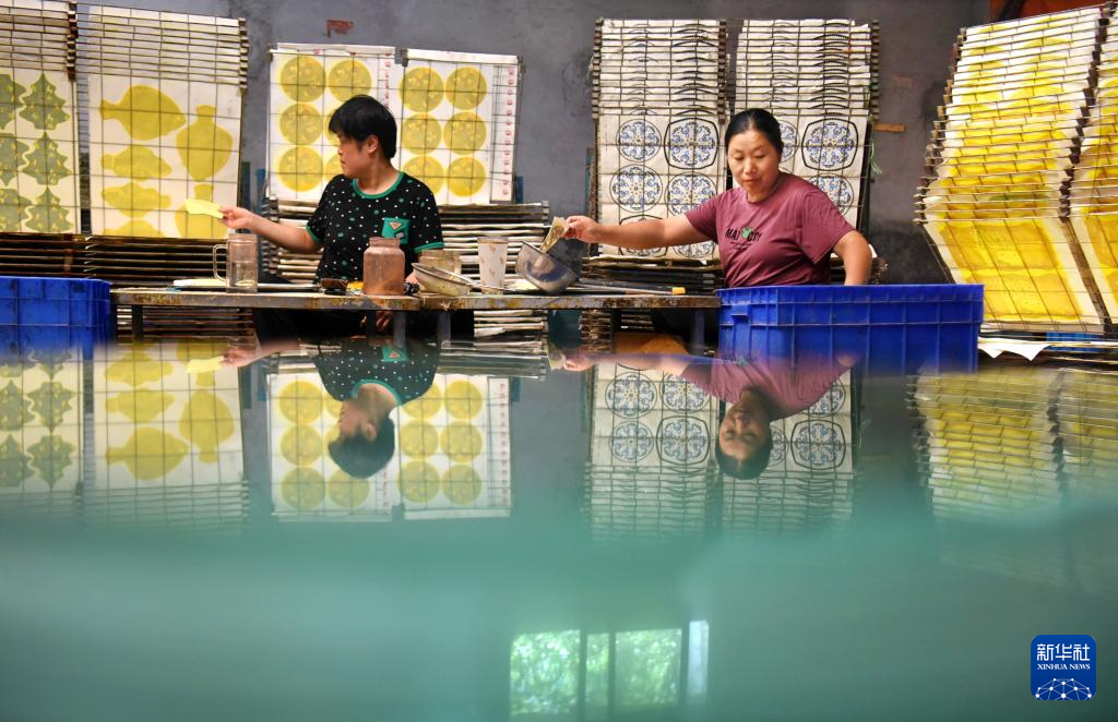 8月15日,在山东省淄博市沂源县悦庄镇东埠村一玻璃制品企业,工人对玻璃进行贴画加工。新华社发(赵东山摄)
