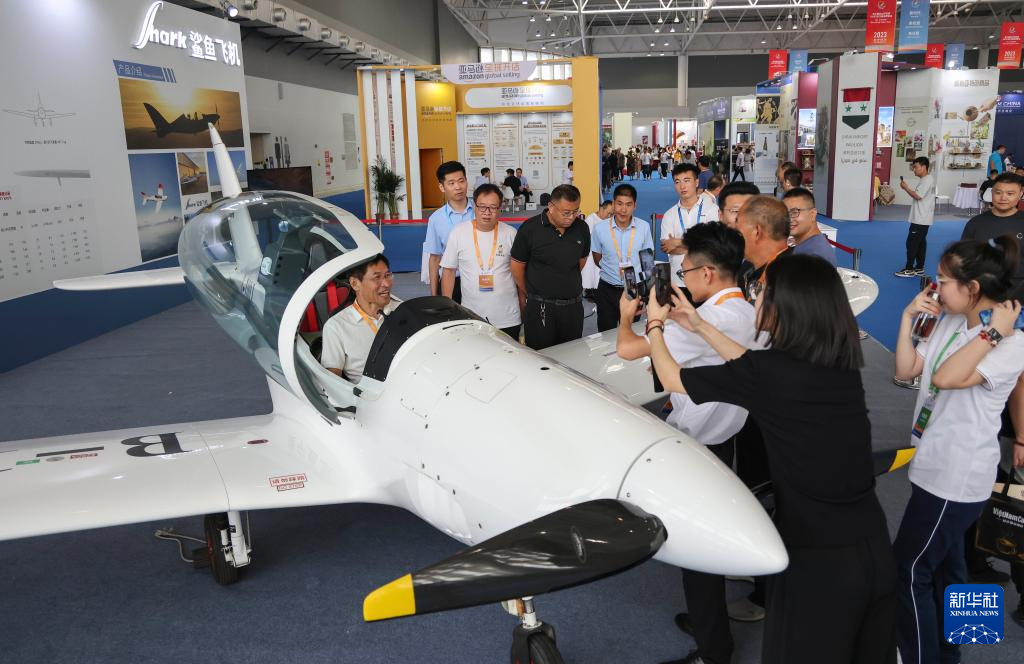 8月18日,客商在第三届RCEP区域(山东)进口商品博览会上了解体验一款国产小飞机。新华社发(许传宝 摄)