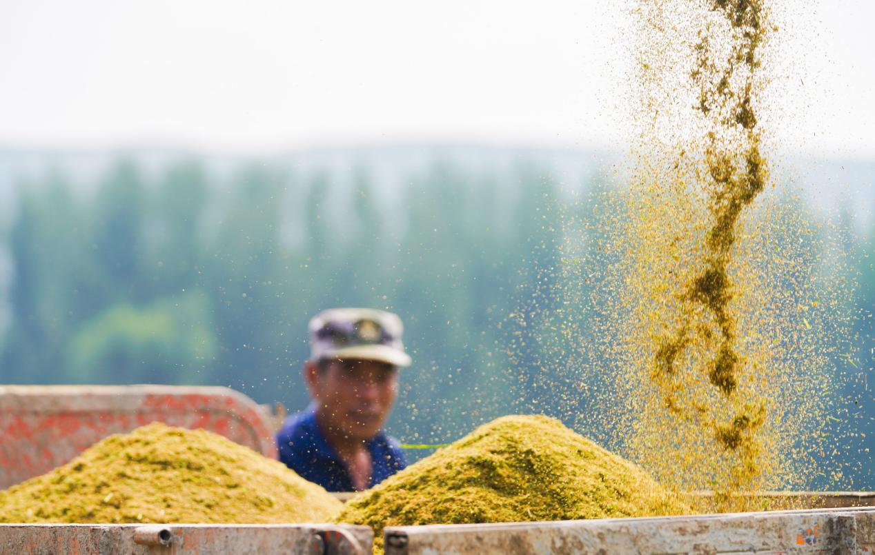 9月4日,山东省邹平市西董街道南部山区鹤伴珍谷种植基地农民在收获谷子。(董乃德 范宜成)