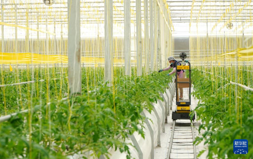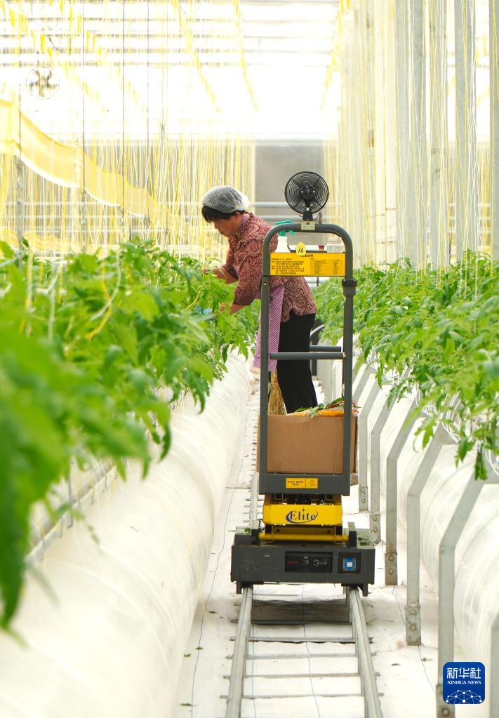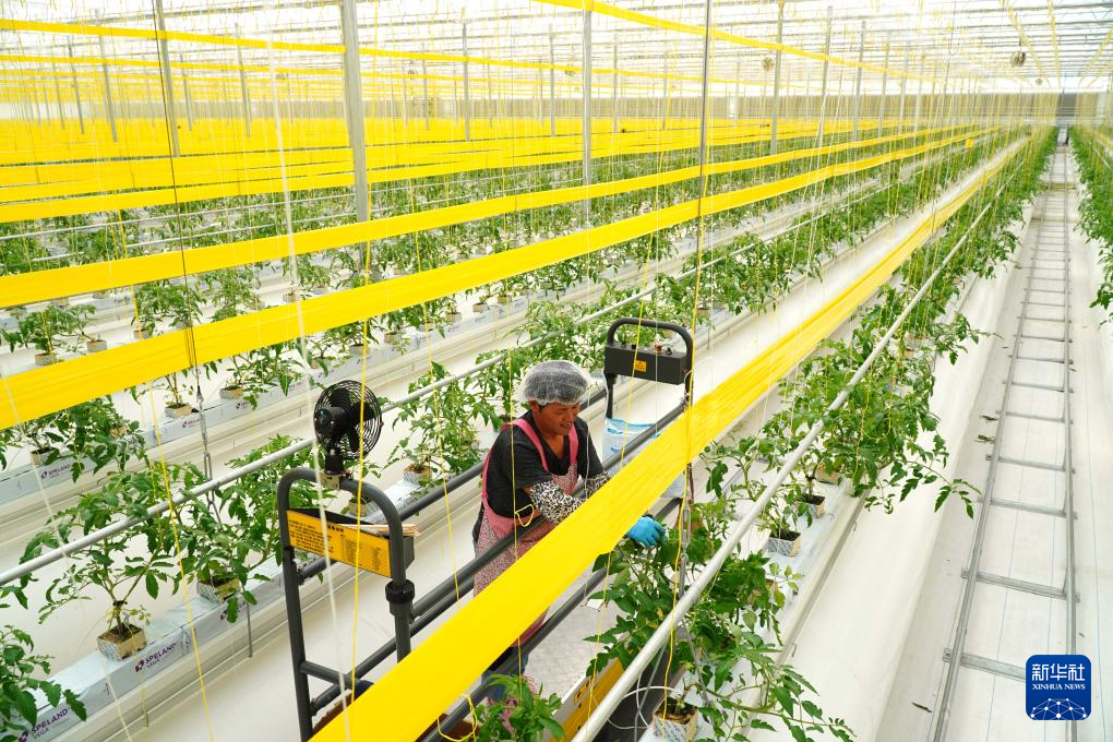 9月6日,在山东省昌邑市饮马镇,蔬菜种植户在高标准种植大棚里培育西红柿秧苗。新华社记者 徐速绘 摄