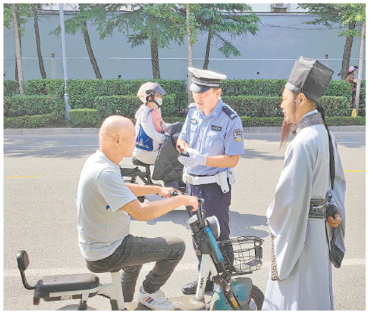 近日,在山东省诸城市超然台路口,一名装扮成苏轼模样的男子与交警一同上路,对没有佩戴头盔的市民进行劝导,还通过向过往驾驶人及群众分析不戴头盔的危害、讲解身边的典型事故案例,教育引导大家牢记交通安全,抵制交通陋习,自觉佩戴安全头盔。