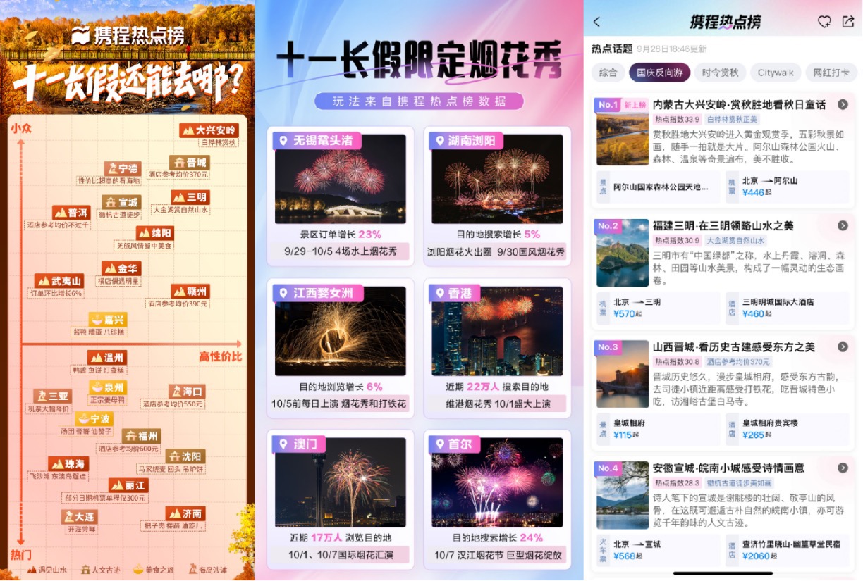 “十一”假期首日,周边游热门目的地为济南、广州、南京、上海、杭州、北京、苏州、天津、郑州、成都;热门旅游目的地为北京、重庆、成都、上海、广州、武汉、西安、长沙、郑州、南京;人气爆棚的景区包括秦始皇帝陵博物院、上海迪士尼度假区、拙政园、中国地质博物馆、北京野生动物园、北京环球度假区、黄山风景区、成都大熊猫繁育研究基地、武汉动物园、八达岭长城等;热门演出有《长恨歌》、《印象大红袍》、广州长隆国际大马戏、《又见平遥》、只有河南·戏剧幻城等。
