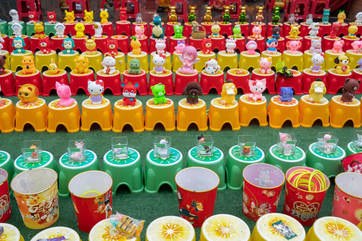 除了美食以外,市集还设置了套圈、打枪、打沙包、大炮乐园、钓金鱼、飞镖、石膏娃娃、挖宝、砸金蛋等趣味性浓、参与性强的传统游艺活动,还有彩虹滑道、充气城堡等大型游乐设施;同时展出精致又漂亮的工艺品、铝编,新奇有趣的手拾,各式百货、套鸟、闪光玩具和玉器等。活泼的摊位立牌、有趣的产品种类,让游客沉浸在逛市集的新鲜感和氛围感中。