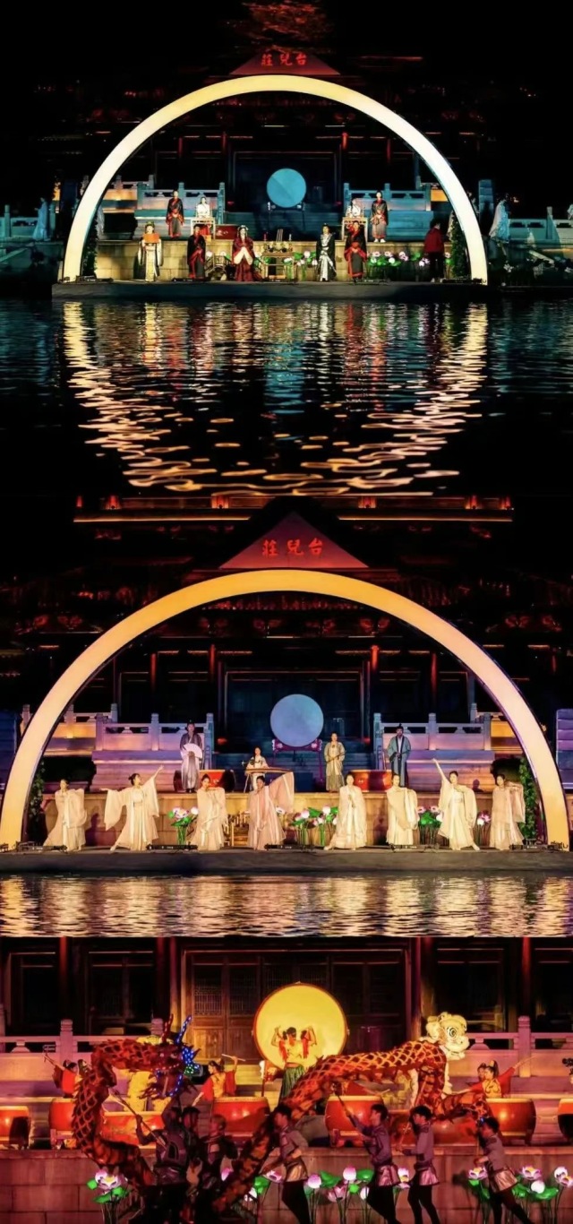 夜幕降临,台儿庄古城水上桨声灯影,陆上游人如织,天空中双月齐辉,由演员扮演的“嫦娥”在《明月几时有》《春江花月夜》《彩云追月》等音乐背景下,时而在月亮中翩翩起舞,时而轻挥衣袖奏起古筝,呈现出天上一个月亮,凡间一个月亮的唯美景观。