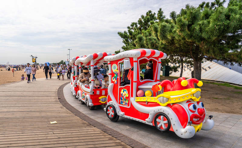 在山东日照,游客在海边乘坐小火车游玩。武爱民 摄