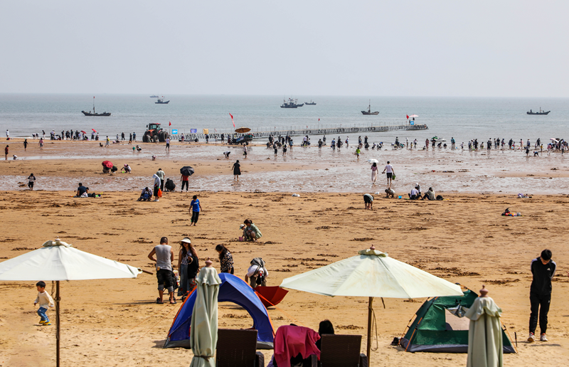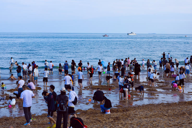 在山东日照,游客在海边踏浪嬉水、赶海拾贝。郭宝安 摄