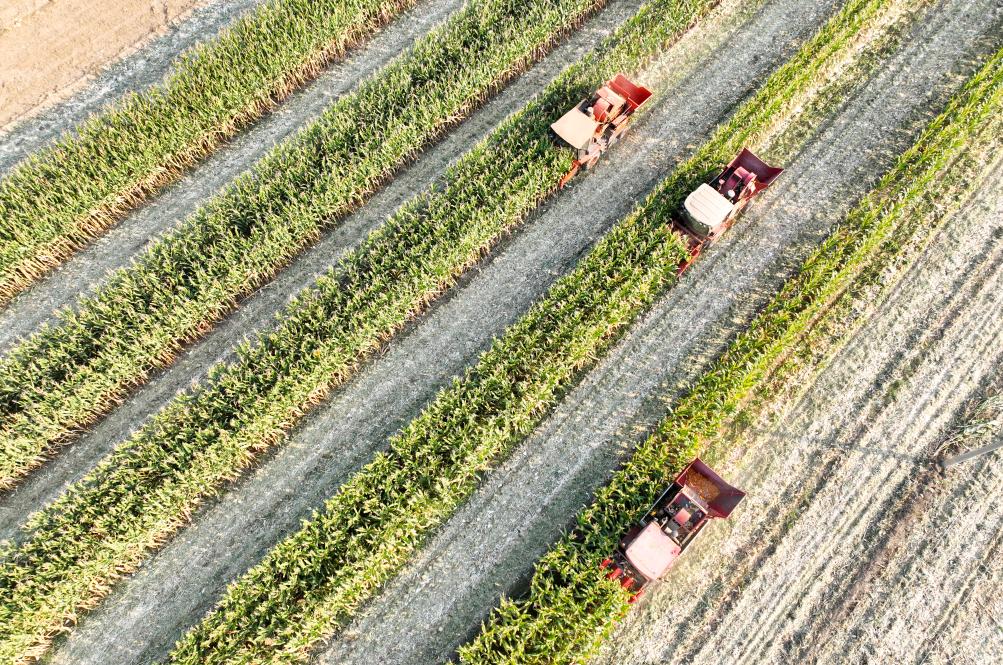 山东省乐陵市孔镇镇吕门楼村的一块玉米地正在收割。新华社记者贾云鹏 摄