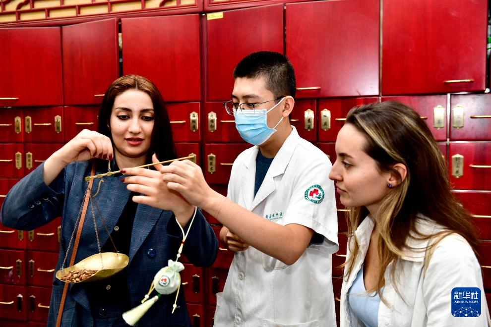 10月18日,在青岛西海岸新区中医医院,山东科技大学国际交流学院伊朗籍留学生哈畀蒂(左一)在体验中药称重。