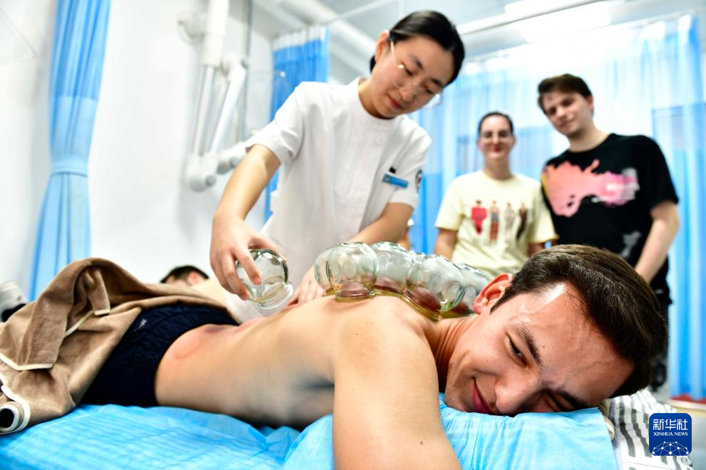 当日,青岛西海岸新区中医医院依托国际学生中医药文化体验基地,与山东科技大学国际交流学院联合,邀请俄罗斯、摩洛哥、斯洛伐克、萨尔瓦多、伊朗等共建“一带一路”国家的留学生,体验针灸、拔罐、推拿、艾灸、耳穴压丸等中医传统疗法,感受中医药文化魅力。新华社记者 郭绪雷 摄