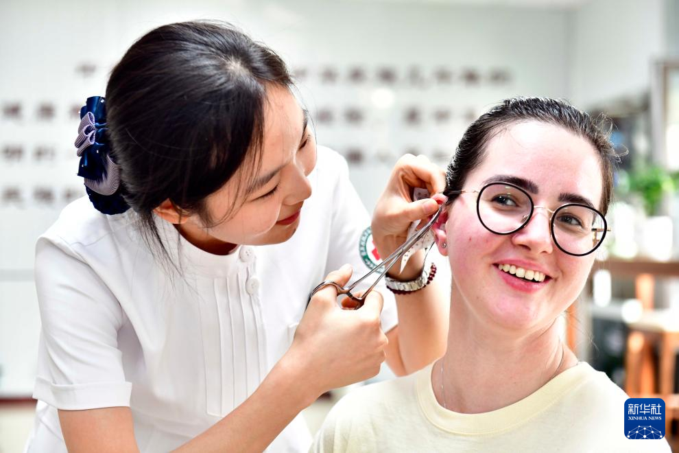 10月18日,在青岛西海岸新区中医医院,山东科技大学国际交流学院斯洛伐克籍留学生梦娜在体验中医传统疗法耳穴压丸。