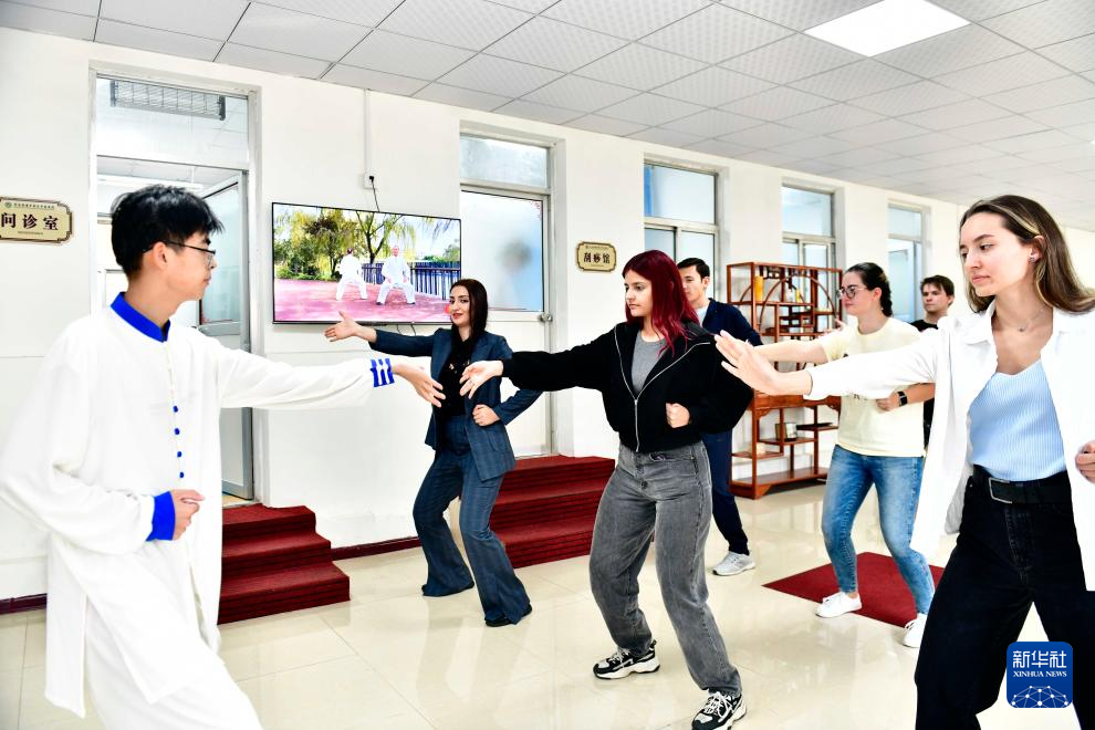 10月18日,在青岛西海岸新区中医医院,来自山东科技大学国际交流学院的留学生在学习八段锦。
