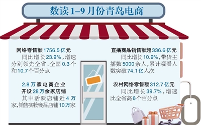 记者从青岛市商务局获悉,1-9月份,青岛市网络零售额1756.5亿元,同比增长23.9%,增速分别领先全省、全国0.3个和10.7个百分点,占山东省网络零售额比重为31.8%,总量居全省首位。