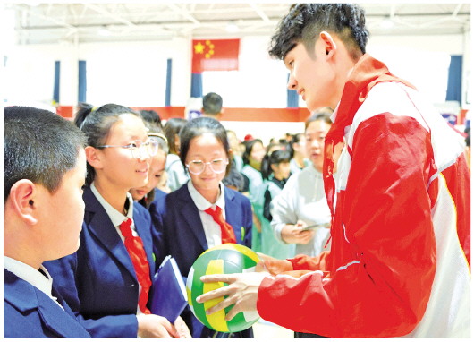 在校园里,奥运射击冠军张梦雪,三届亚运会、两届全运会武术冠军孙培原,亚运会、全运会撑杆跳高冠军薛长锐,全运会体操团体冠军王鹏,全运会三人制女子篮球冠军胡月,全运会男子排球冠军范宣玉,与学生们现场交流、亲密互动,手把手地教授学生练习要领。图为范宣玉与学生们互动交流。
