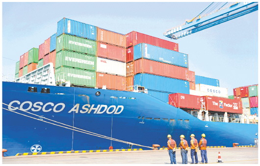 11月1日,“中远阿什杜德”轮在山东港口青岛港全自动化码头装载货物。